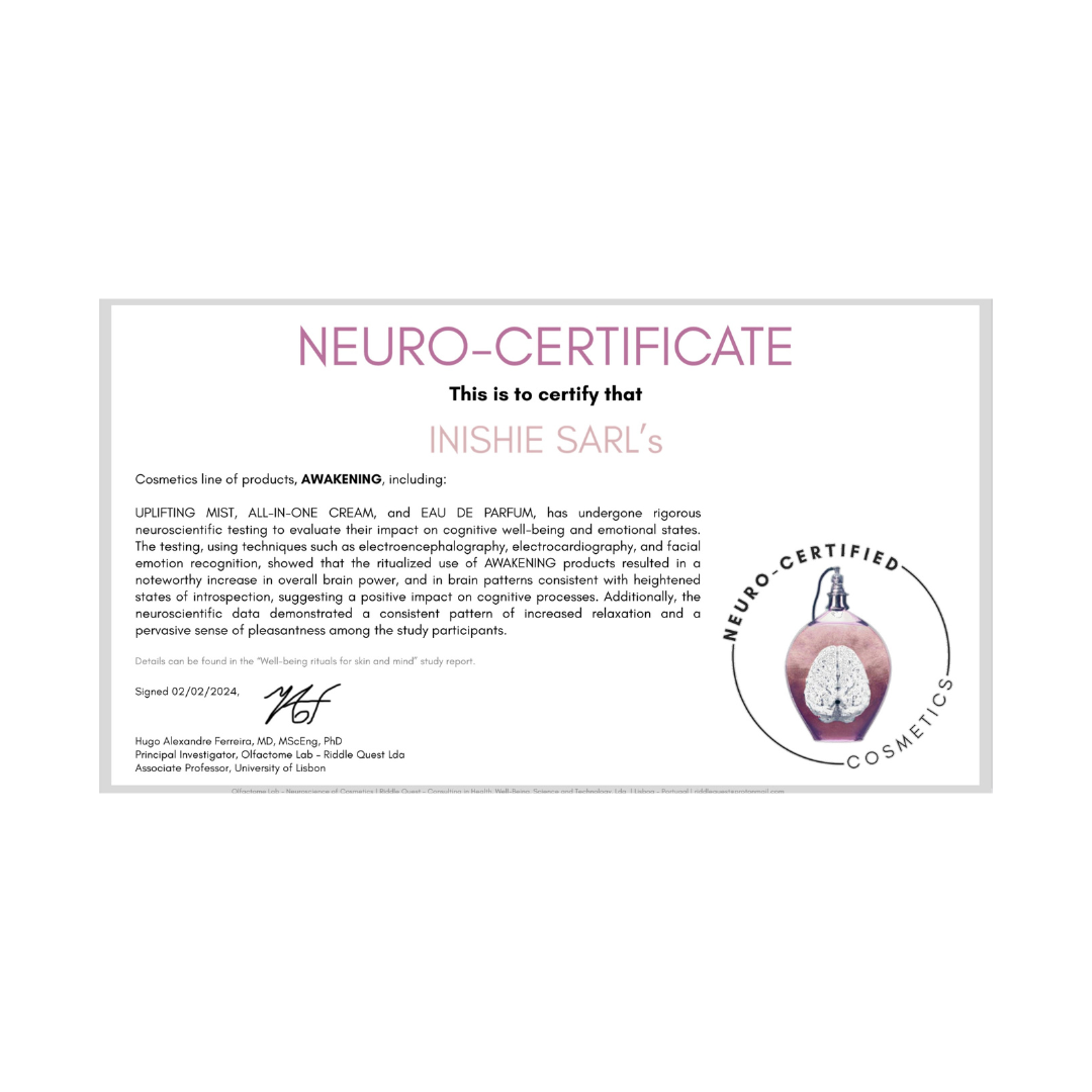 Study with Professor Hugo Ferreira from the Olfactome Lab of the university of Lisbon, Portugal , INISHIÉ ‘s ritual “AWAKENING” has undergone rigorous neuroscientific testing to evaluate the impact on cognitive well-being and emotional states. The testing is using techniques such as EEG, ECG, breathing rate and facial emotion recognition.